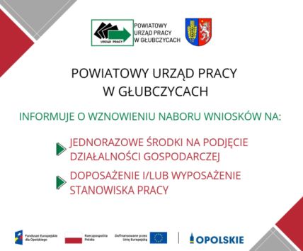 Powiatowy Urząd Pracy w Głubczycach informuje o wznowieniu naboru wniosków na: - jednorazowe środki na podjęcie działalności gospodarczej, - doposażenie i/lub wyposażenie...